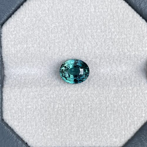 This sapphire features a beautiful deep green teal color, which gives it a unique allure. Its oval cut enhances the natural sparkle and brilliance, making it perfect for those who appreciate the finer things in life.